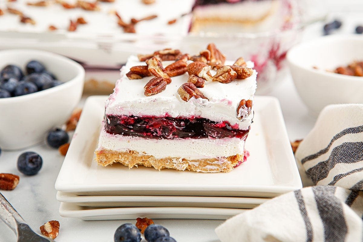 It’s super easy to make ahead of time, which is great for cookouts or when you need to bring a dessert to a cookout. The layers of creamy cheesecake, sweet blueberries, and fluffy whipped topping are a combo that everyone will love.