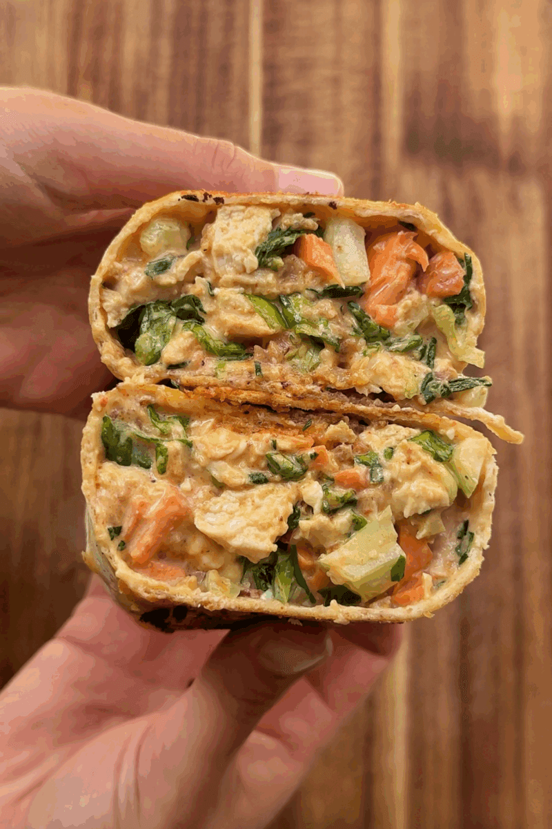 The best thing about chopped salads in a sandwich or wrap, is that you get all the flavour in one bite. For this buffalo chicken wrapimagine getting a pop of blue cheese, a hit from the buffalo sauce, creaminess from the mayo, crunch from the carrot, and juiciness from the chicken. It’s SO good, I can’t wait for you to try it!