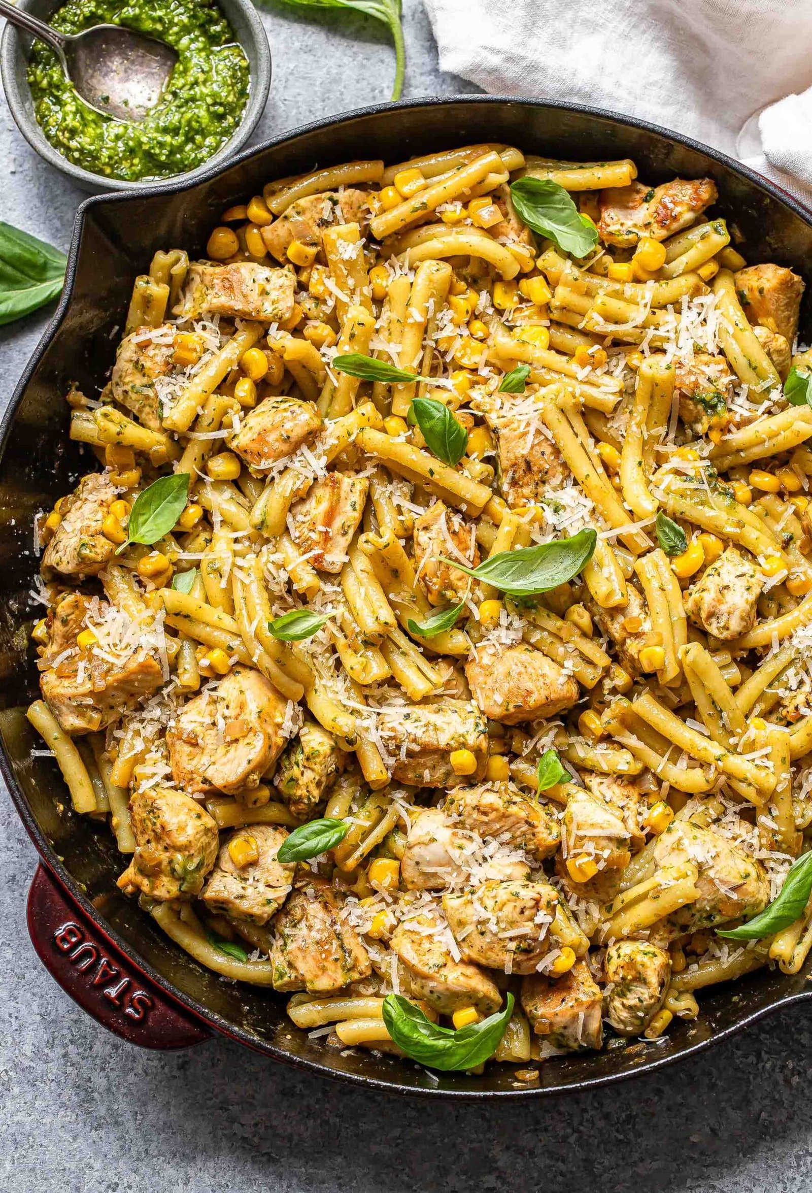Creamy pesto chicken and corn pasta is a rich and flavorful pasta dinner that only takes 30 minutes to throw together! Pesto gives the pasta tons of fresh basil flavor and a little cream added to it creates the most luxurious velvety sauce. It’s perfect for weeknights and will be a new family favorite!