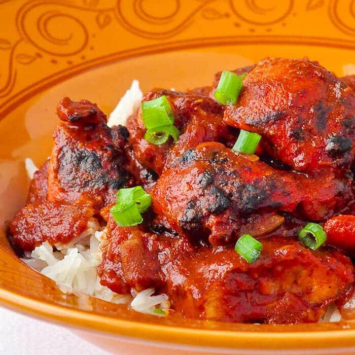 The yogurt marinade tenderized the meat beautifully and kept this chicken very moist and juicy. Even after broiling, then simmering in the sauce.