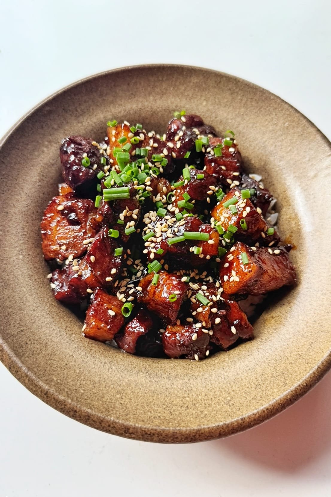 I love serving braised pork belly with rice, noodles, or on its own! I also love serving it with veggies – tenderstem broccoli, edamame beans, chinese cabbage, or cucumber salad.