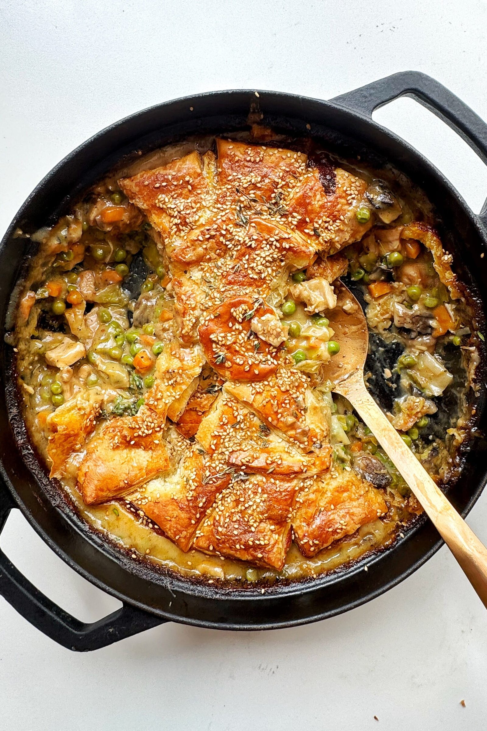 The base of the chicken pot pie is made up of leeks, garlic, chicken, mushrooms, carrots, peas, cream of chicken soup, paprika, dried oreganoand then the casserole is topped with puff pastry. The flavours are comforting and perfect for the autumn/fall season.