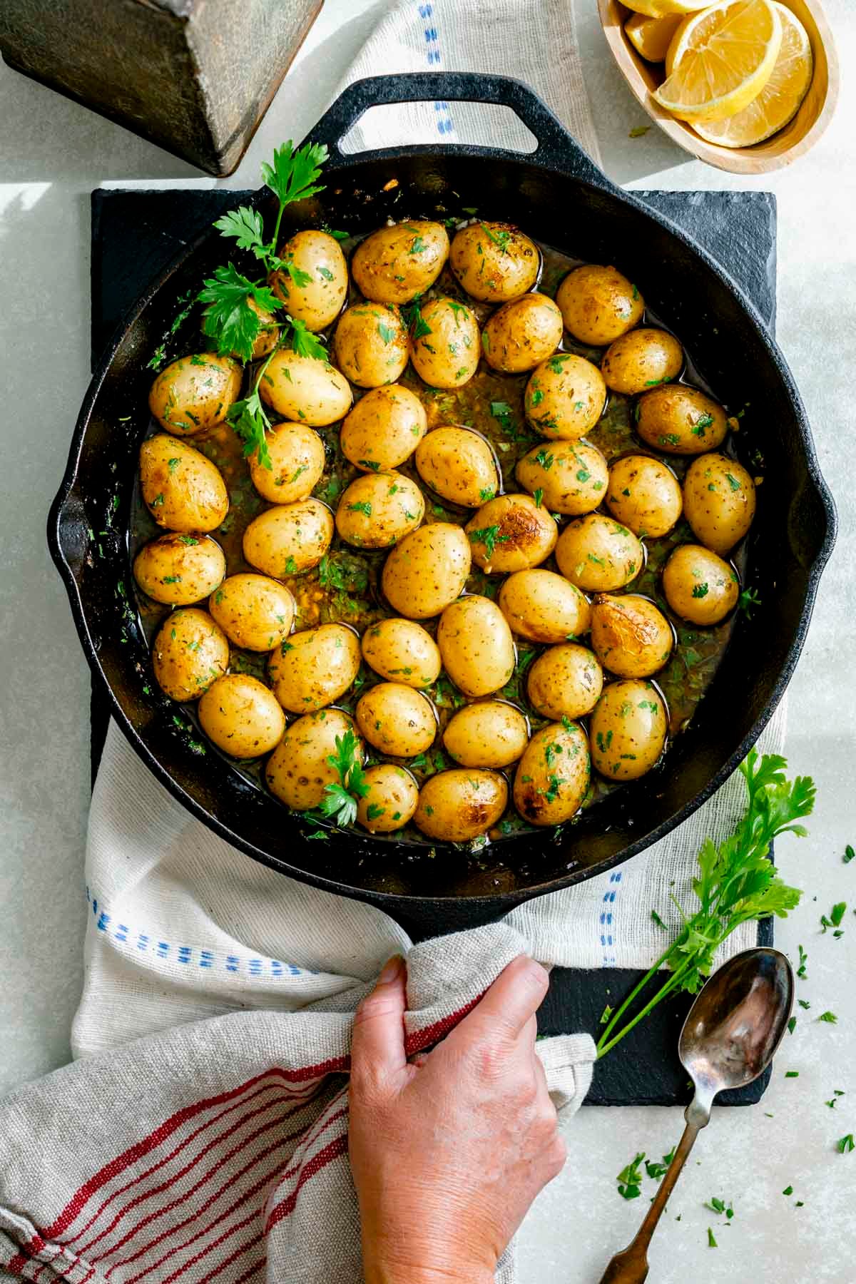 This lemon garlic Greek Potatoes recipe is coming hot off the pages of the brand new Mediterranean cookbook by bestselling cookbook author Suzy Karadsheh of The Mediterranean Dish. I’m not exaggerating when I say my kitchen has never smelled better than when I made lemon garlic roasted baby potatoes. And they pass the taste test too! More than pass! So if you are looking for an easy side dish to pair with Greek food, this recipe is a winner!