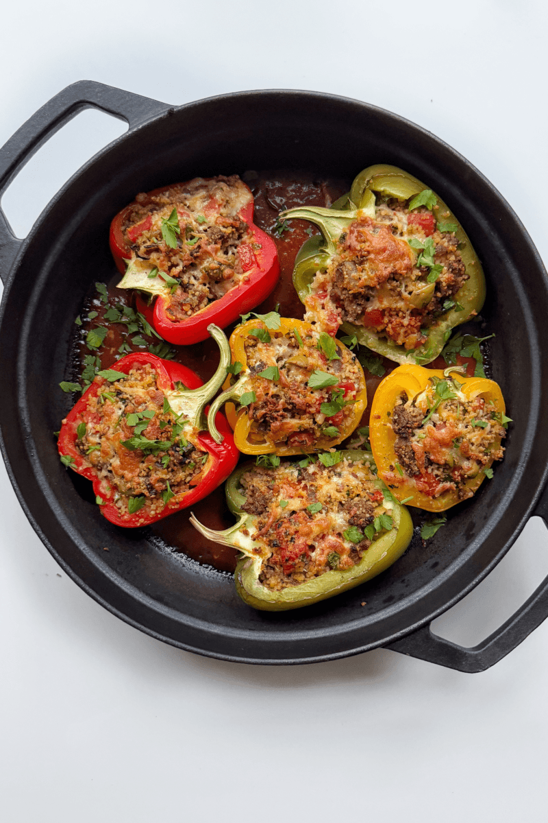 Ease: The most difficult part of this recipe is slicing the peppers and removing the seeds and placenta (the white bit of the pepper). So once you’re past that, this stuffed peppers recipe is a breeze.