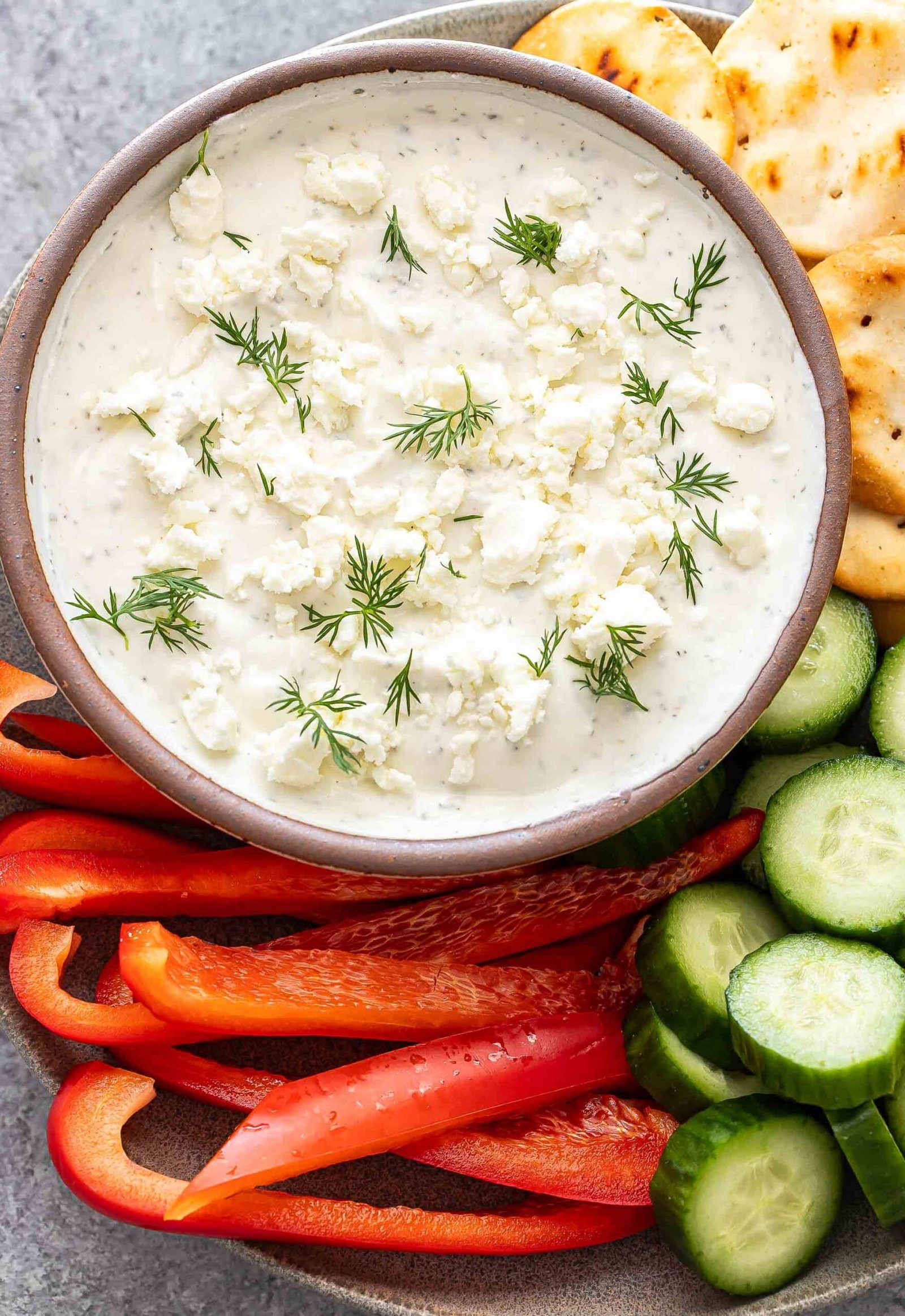 Top with additional crumbled feta and fresh dill if desired. Serve cold with veggies, crackers, pita, shrimp, or chicken.