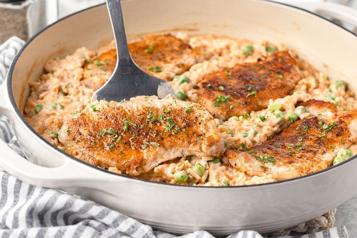 • Add the cooked rice and thawed peas to the skillet, stirring gently to combine with the creamy sauce.