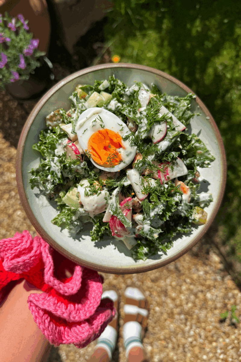 This vibrant salad is packed full of fresh ingredients including cucumber, kale, radishes, walnutsand eggs. It’s great served as a main dish or as a side salad!